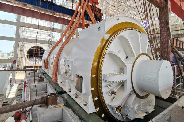 本次吊裝的2號機組發電機重量為360噸,是項目最重設備。安徽電建一公司策劃優化吊裝方案,細致檢查吊裝系統安全、技術措施,并對作業人員進行交底,強調發電機吊裝工序及安全注意事項。在管理人員的旁站監督和作業人員的默契配合下,2號機組發電機被勞辛格吊裝系統緩緩提升至預定高度進行轉向、平移,抵達發電機基礎中心線上方后緩慢降落,最終安全精準就位。
