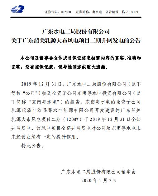 1月2日,粵水電公告稱,2019年12月31日,公司接到全資子公司東南粵水電投資有限公司(“東南粵水電”)的報告,東南粵水電的全資子公司乳源瑤族自治縣粵水電能源有限公司開發建設的廣東韶關乳源大布風電項目二期(120MW)于2019年12月31日全部并網發電。該風電項目全部并網發電對公司及東南粵水電未來經營業績有一定的提升作用。