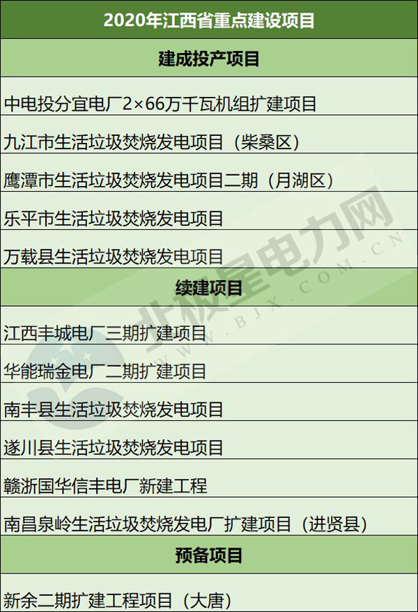 江西省2020年第一批省重點建設項目計劃中,涉及的火電項目、垃圾焚燒發電項目如下: