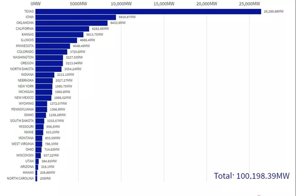 其中,得克薩斯州以26.4GW遙遙領先,其次是愛荷華州、俄克拉荷馬州、加利福尼亞州、堪薩斯州,均超過了5GW。