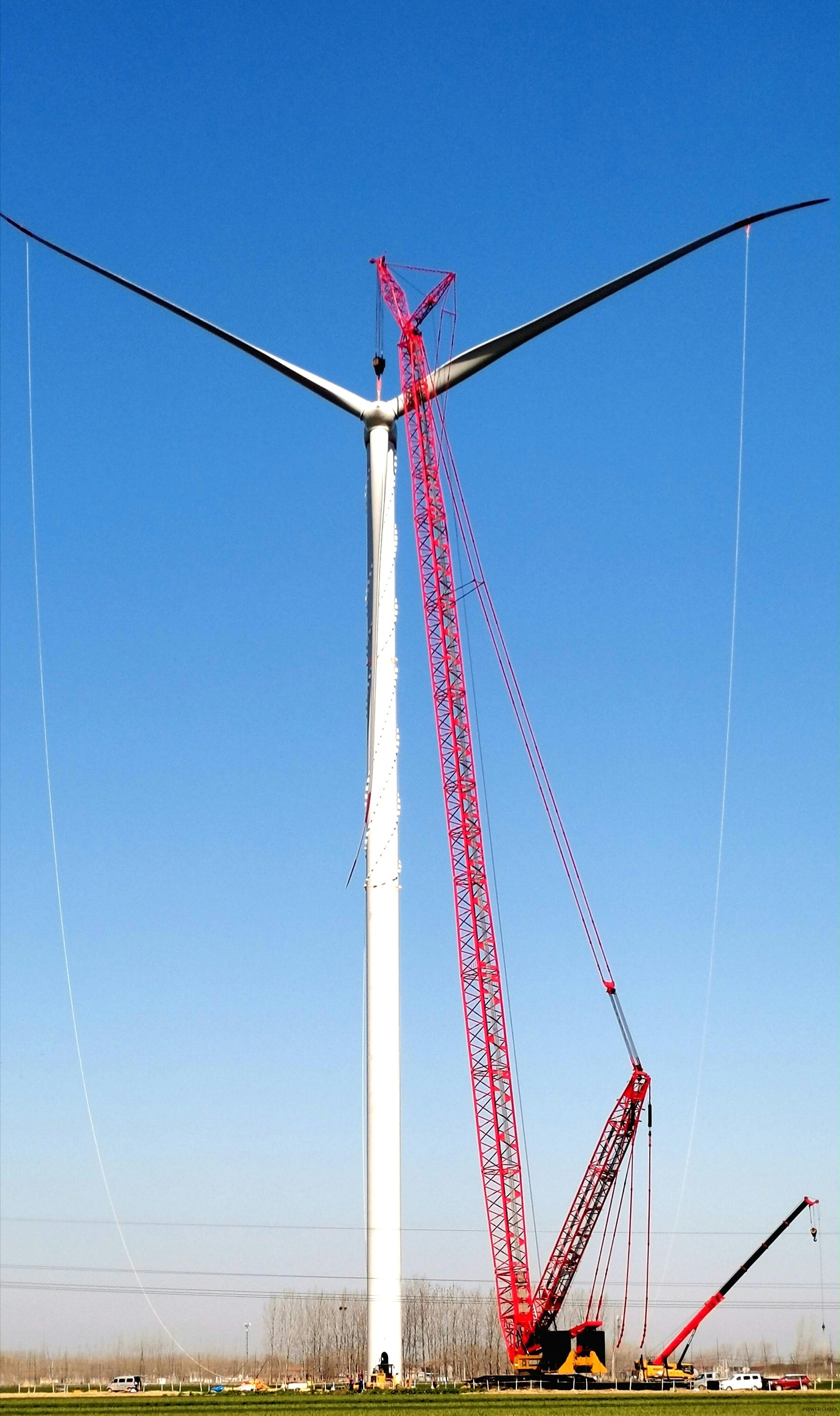 陽春時節,山東西南二期100兆瓦風電項目施工現場艷陽高照。3月15日, 隨著SCC6500A履帶吊將66噸葉輪提升至125米就位高度,輪轂與機艙實現完美結合,宣告山東西南二期100兆瓦風電項目首臺風機吊裝圓滿完成。