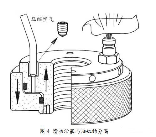 滑動活塞與油缸的分離:松掉放氣螺釘,用壓縮空氣吹放氣口,活塞很容易從油缸中滑出(見圖4);