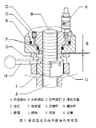 液壓螺栓拉伸器是一種比較先進的螺栓裝配方法,特別適用于狹窄空間和重負荷振動機械堅固。其主要部件有(見圖1)滑動活塞D、油缸E、支撐環G、密封圈F、放氣螺釘C和快速接頭A等。液壓螺栓拉伸器的工作原理是液壓螺栓拉伸器安裝于螺栓的上部,滑動活塞的內螺紋旋到螺栓上部的螺紋內,從氣動液壓油泵來的高壓油通過快速接頭連接到由油缸E和滑動活塞D形成的密封空間內,液壓油作用在滑動活塞上,使滑動活塞對螺栓J施加外力進行軸向拉伸,被施加力的螺栓在其彈性變形區內被拉長,螺栓拉長后旋緊螺帽I,這樣螺栓就會被鎖在拉長的位置上。