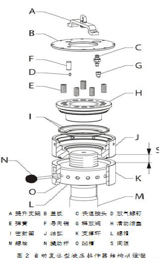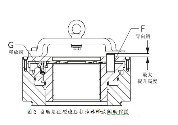 自動復位型液壓螺栓拉伸器(見圖2)與普通式液壓螺栓拉伸器工作原理基本相同,只是結構上稍微復雜一些,主要增加了以下部件:蓋板B、彈簧E、導向銷F、釋放閥G?;瑒踊钊纳掀矫嬗形鍌€盲孔用來安裝彈簧,蓋板壓緊五個彈簧,使滑動活塞與油缸緊密接觸。當高壓油進入到滑動活塞和油缸形成的密封空間時,滑動活塞向上移動,五個彈簧受壓;高壓油泄放后,滑動活塞在五個彈簧的作用下自動復位到原始狀態,密封空間的液壓油回流到液壓油泵。如果滑動活塞向上移動的距離超過液壓螺栓拉伸器的最大提升高度(見圖3),滑動活塞上的釋放閥會碰到蓋板,引起釋放閥的動作,密封空間的高壓油會立即釋放,通過肉眼可以觀察到蓋板下有液壓油流出。通過觀察導向銷的伸長量來判斷液壓螺栓拉伸器是否超過最大提升高度。