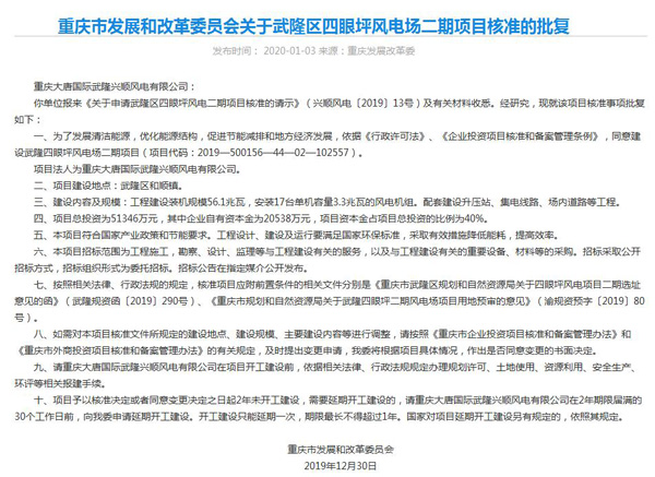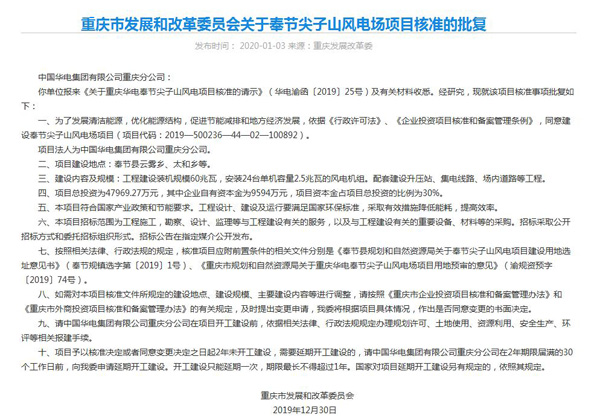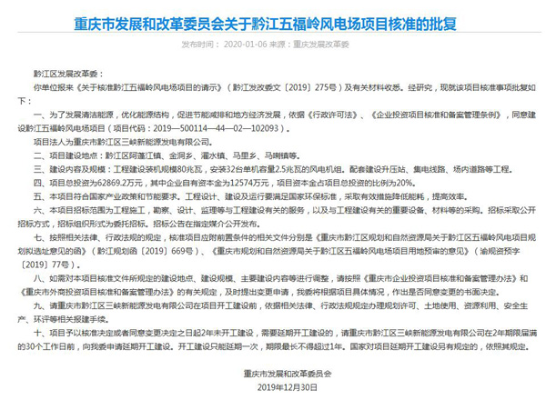 2019年12月30日,重慶市新核準三個風電項目,分別是奉節尖子山風電場項目、武隆區四眼坪風電場二期項目、黔江五福嶺風電場項目。三個項目總容量接近200MW。