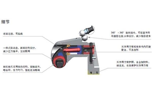 液壓扳手由動力頭、工作頭、液壓扳手專用泵以及高壓油管,快速接頭組成。通過高壓油管,液壓泵將動力傳輸到工作頭,驅動工作頭旋轉螺母的擰緊或松開。