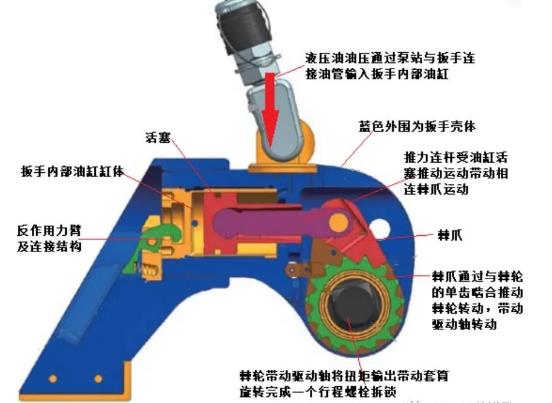 液壓扳手的本體主要由三部分組成,本體(也叫殼體),油缸和傳動部件。油缸輸出力,油缸活塞桿與傳動部分組成運動副,油缸中心到傳動部件中心距離是液壓扳手放大力臂,油缸出力乘以力臂,就是液壓扳手理論輸出扭矩。